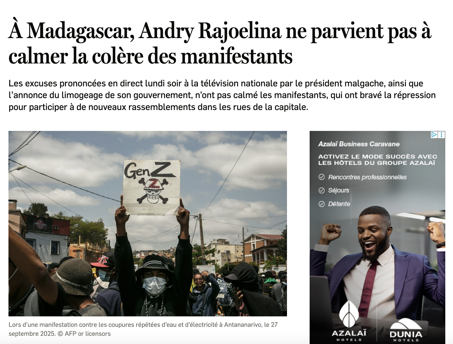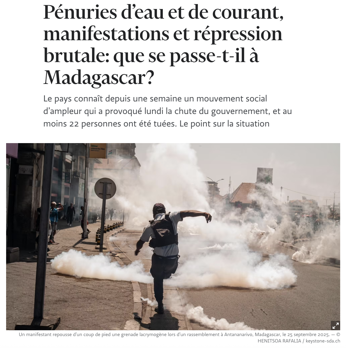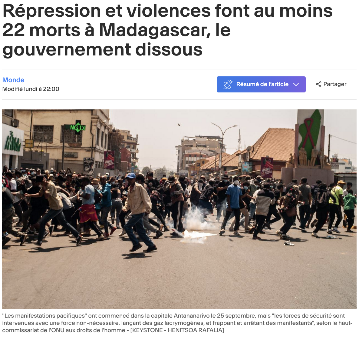 Quelques nouvelles de Madagascar où la situation est compliquée depuis jeudi passé. Les étudiants ont décidé de descendre dans la rue pour protester contre les coupures électriques et d’eau, ainsi que contre la corruption. Leurs revendications se sont élargies : ils demandent la démission du gouvernement. Malheureusement, la police a répondu de manière violente. Il y a des blessés et des morts (22 en début de semaine). Des casseurs se sont attaqués aux commerces et les vols vers l’île ont été suspendus.