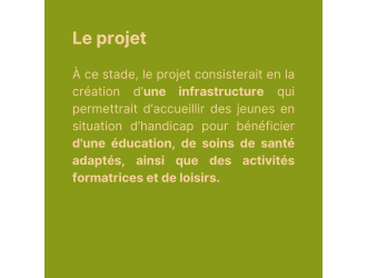 Créer un lieu d’accueil, de scolarisation et de loisir pour des mineurs en situation d'handicap. Ando Miarisoa Ratiandraibe, gestionnaire du Centre de Santé de Base sur le site, organise régulièrement, avec le maire d’Antsirabe II, des journées pour les personnes handicapées du district. Lors de ces rencontres, elle a fait le constat que les personnes mineures ayant un handicap sont souvent laissées seules au domicile pendant que les parents travaillent.